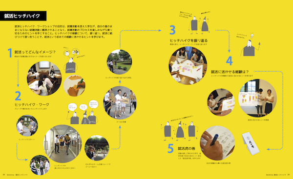こちらのワークショップは、就活前の学生を対象に開発されたものです。「就活」が「ヒッチハイク」に喩えられており、このメタファのもと、学生達は「自分の意のままにならない就職活動に翻弄されることなく、就職活動のプロセスを楽しみながら乗り切るためのヒント」を学びます。