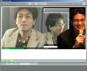 ところで、今年で三年目になりますが、学会開催中に「若手の飲み会」というのを毎回開催しています。今年は、望月君@総合研究大学院大学がディレクターになって、四月から企画してくれました。 僕は、その会の冒頭に「ご挨拶」ということだけ出させてもらいました。もちろん、ボストンからインターネットでの中継です。この中継は、松河君@大阪大学、重田君@大阪大学が担当してくれました(忙しいところありがとう)。 システムには、ハイパーミラーを用いました。このシステム、両地点の画像を合成するのが特徴で、あたかも「隣で話しているか」のような感覚で、話すことができます。 下記はその様子。