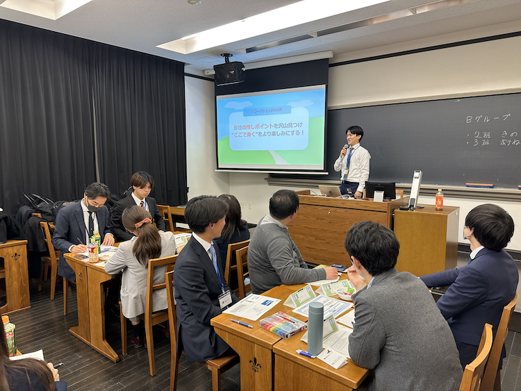 学生に貴重な機会を与えていただき、ありがとうございます。この活動は、すでに3年にわたって行われており、すでに合計「150社」で、中原ゼミで開発したワークショップが導入されているそうです。ワークショップの参加者の数で申しますと、中原ゼミ発のワークショップは、すでに数万人の方々に受講いただいている計算になります。