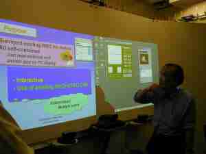 ギガビットネットワークのTCP/IP上でDVTSを用いた転送実験を行いました。ものすごく綺麗。DV画質もこのくらいの帯域があれば余裕で海をわたるのですね。写真は、NIME側のDV画像。 |