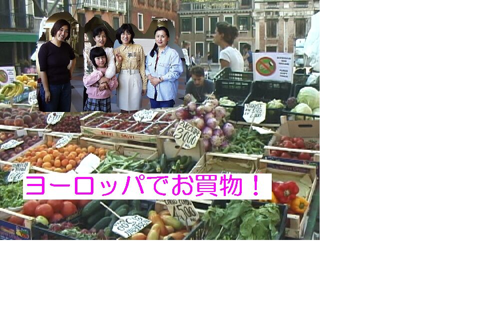 | 「ペイント」を使って、簡単な画像合成をしてみました。なぜか、ヨーロッパの市場にいます。 | 綺麗な合成ですね。「PASOKON CLUB」という文字もいれてみたんです。 | |